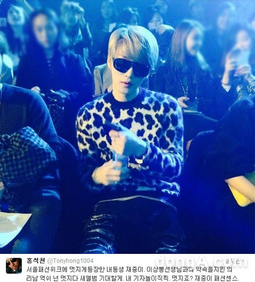 홍석천은 21일 자신의 트위터에 “서울패션위크에 멋지게 등장한 내 동생 (김)재중이. 이상봉 선생님과의 약속을 지킨 의리남 역시 넌 멋지다 새 앨범 기대할게. 내 기자놀이 직찍. 멋지죠? 재중이 패션센스”라는 글과 사진 한 장을 게재했다.