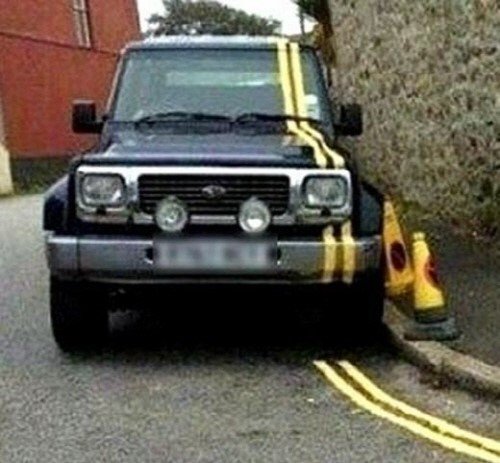 사진 속 불법으로 주차된 차량 때문에 작업자가 차선을 제대로 그릴 수 없게 되자, 작업자는 고집스럽게 자동차에 노란 선 두 줄을 그어 차선을 완성했다.