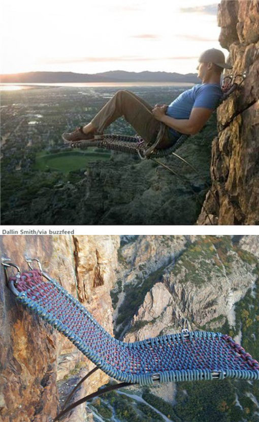 미국의 디자이너 겸 암벽 등반가로 알려진 이 사나이는 미국 유타주 록캐년의 절벽에 의자를 설치해 사진을 찍었다.
