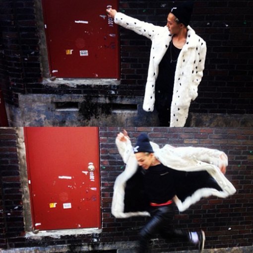 공개된 사진에는 지드래곤이 흰색 퍼 소재의 코트와 비니를 쓴 모습이 담겨 있다. 특히, 지드래곤은 빨간 문을 여는 듯한 모습과 달려가는 듯한 포즈를 취해 눈길을 끌었다.