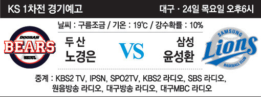 4선승제의 KS 1차전은 24일 오후 6시 대구구장에서 두산 노경은-삼성 윤성환의 선발 맞대결로 막을 올린다.