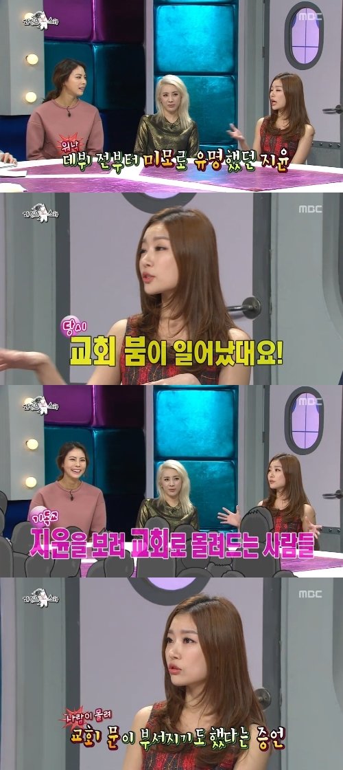 레이디제인은 “허밍어반스테레오가 말해준 이야기다. 박지윤이 정말 예뻐서 사람들이 박지윤을 보러 교회에 몰려들었다. 교회 문이 다 부서졌다고 들었다”고 말했다.