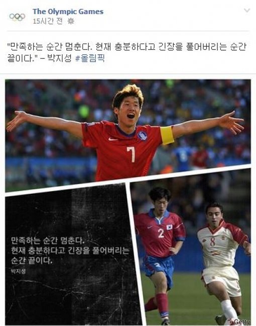 IOC는 23일(이하 한국시각) 공식 페이스북을 통해 한국 축구대표팀 유니폼을 입고 활약하는 박지성의 사진을 게재했다.