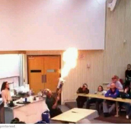 공개된 ‘화끈한 화학 시간’ 사진에는 교사로 보이는 한 남성이 화염방사기로 보이는 도구를 들고 화끈하게 불을 뿜어내고 있다.