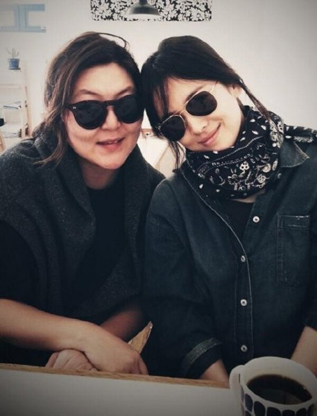 사진은 스타일리스트 한혜연과 송혜교의 모습을 담고 있다. 두 사람은 선글라스를 쓰고 머리를 맞댄 채 밝은 미소를 짓고 있다.