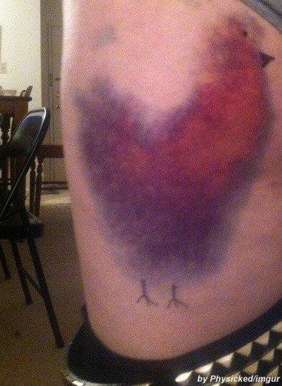 ‘치킨 멍자국’을 만들어낸 사람은 사진 속 멍이 든 사람의 친구로 알려졌다. 친구의 몸에 멍이 든 것을 본 이 사람은 멍자국에 부리와 발 등을 그려 넣어 ‘치킨 멍자국’을 완성했다.