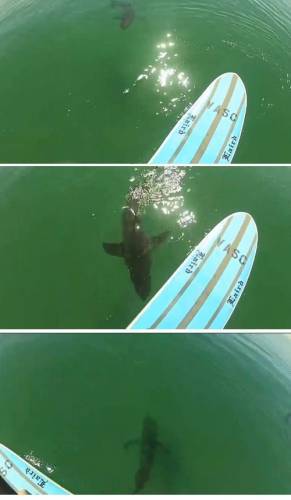 공개된 영상은 미국 캘리포니아 남부 맨해튼 비치에서 서핑을 즐기던 마이크 더랜드라는 남성이 촬영한 것으로 이 남성은 자신의 서핑보드 밑을 지나가는 백상아리를 보고 촬영했다고 밝혔다.