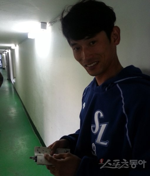 24일 두산과의 한국시리즈(KS) 1차전을 앞둔 대구구장. 강명구는 주머니 안의 수첩을 꺼냈다. 수첩 안에는 상대 투수들의 버릇 등을 적은 메모가 빼곡했다. “2005년부터 떠오르는 것들을 끼적이기 시작했어요. 투수들이 버릇을 고치기 때문에 저 역시 꾸준히 업데이트를 합니다.” 경기 막판 등장하는 대주자지만, 그의 주루플레이는 이미 덕아웃에서부터 시작되는 셈이다. 면밀한 관찰을 업으로 삼다보니, 이제는 일상생활에서도 5분만 얘기해보면 상대를 파악하는 경지에 이르렀다. 그는 “요즘은 상대가 연구를 워낙 많이 하다보니, 대주자 요원이 먹고 살기 더 힘들어졌다. 시력보호제라도 챙겨야겠다”며 미소를 지었다.