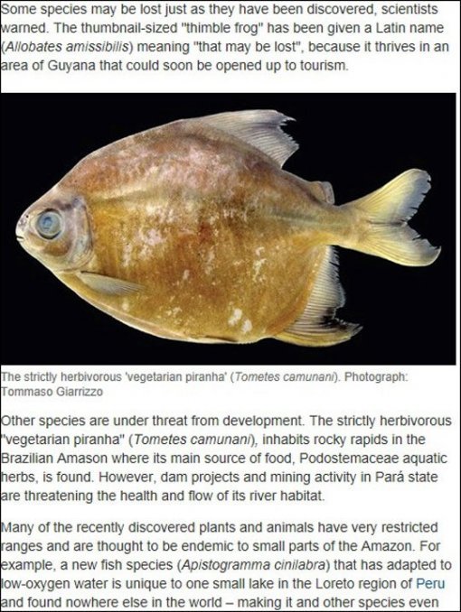 특히 이번 발견에서 눈길을 끄는 것은 가르랑거리는 신종 원숭이와 불타는 듯한 무늬를 가진 도마뱀, 살점을 좋아하지 않는 피라냐 등이었다.