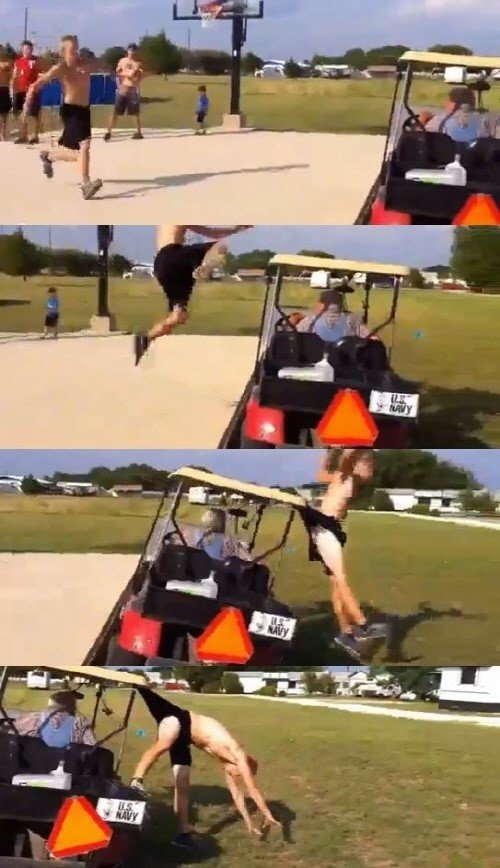 이 남성은 높이 뛰어 올라 골프 카트를 넘는 듯 싶더니 카트 지붕 끝에 바지가 걸리며 카트에 매달리고 말았다.