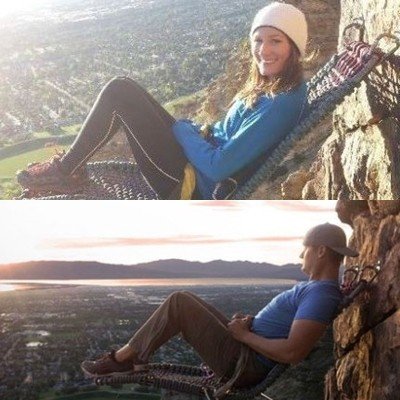 사진에는 한 남성이 벼랑에 설치된 의자에 기댄 채 절벽 아래를 내다보고 있는 모습이 담겨 있다. 또 다른 사진에는 여성이 같은 자세를 취하고 있다.