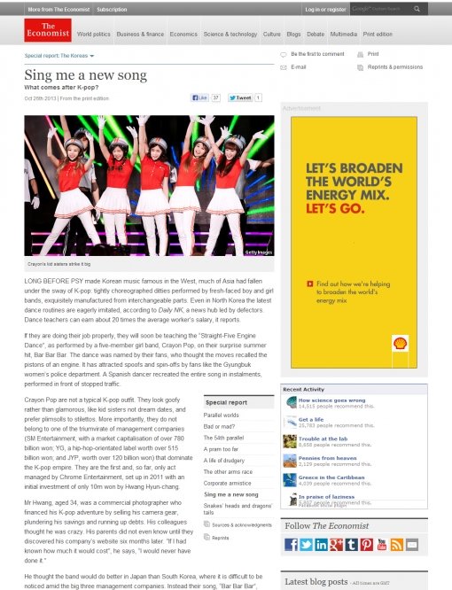 이코노미스트가 국내 걸그룹에 대한 특집 기사를 다룬 것은 극히 이례적이다. 특히 크레용팝의 소속사인 크롬 엔터테인먼트에 대해서도 자세히 다루며 대형 기획사와의 비교를 통해 성공 비결을 분석했다.