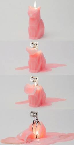 공개된 사진에는 분홍색 고양이 모양의 초가 타고 있는 모습이 담겨 있다. 특히 초가 모두 타고 난 뒤 초 안의 뼈대가 드러난 모습이 보는 이들의 시선을 사로잡았다.
