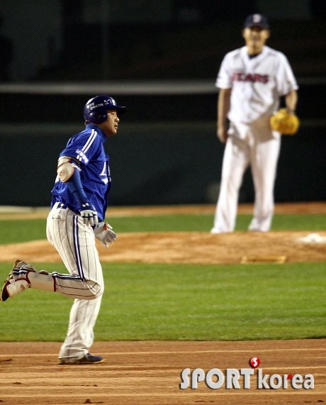 ‘2013 한국야쿠르트 세븐 프로야구’ 삼성 라이온즈와 두산 베어스의 한국시리즈 9차전이 29일 오후 잠실야구장에서 열렸다. 1최초 2사에서 삼성 채태인이 두산 선발 노경은을 상대로 좌월솔로홈런을 친 후 그라운드를 돌고 있다.