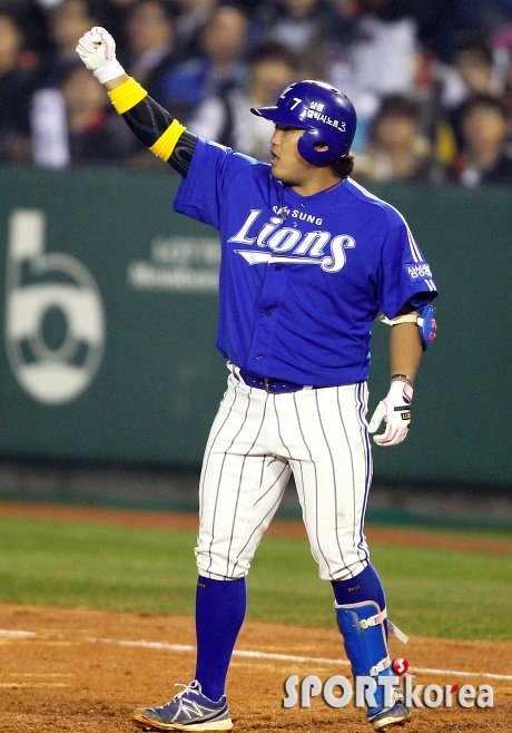 29일 오후 서울 잠실구장에서 열린 ‘2013 한국야쿠르트 세븐 프로야구’ 두산 베어스와 삼성 라이온즈의 한국시리즈 5차전에서 삼성 6번 박석민이 5회초 2사 1,2루 때 2루주자 채태인을 불러들이는 적시타를 때리고 주먹을 불끈쥐고 있다.