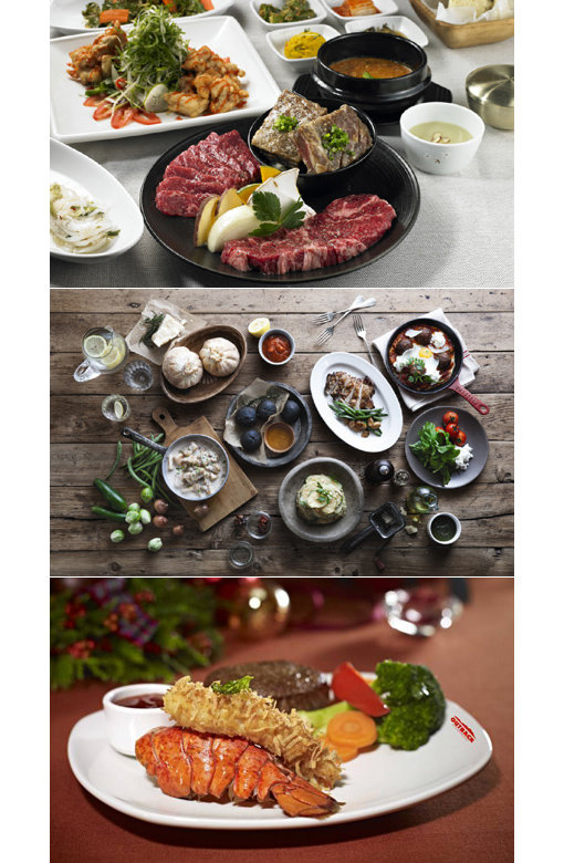 적은 양의 음식을 여러 접시로 즐기는 스몰 플레이트가 인기를 끌면서 국내 외식업계에서도 다운사이징 메뉴들이 잇달아 출시돼 주목받고 있다. (위부터)불고기브라더스의 구이 세트 메뉴와 더플레이스의 스몰 플레이트 메뉴, 아웃백 스테이크하우스의 랍스테이크.