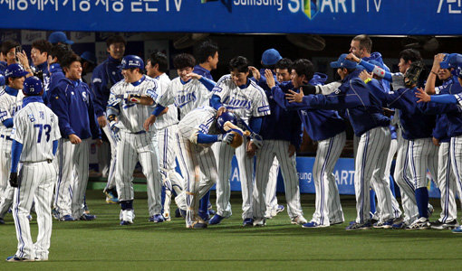 채태인이 삼성을 구했다면, 박한이는 두산의 혼을 뺐다. 삼성 박한이(가운데 고개 숙인 선수)가 31일 대구구장에서 열린 KS 6차전에서 3-2, 1점차 불안한 리드가 지속되던 7회말 승부에 쐐기를 박는 3점홈런을 날린 뒤 동료들의 거센(?) 환영을 받고 있다. 사진제공|스포츠코리아