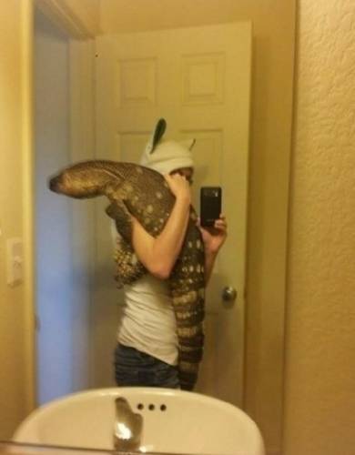 공개된 사진에는 한 여성이 거대한 도마뱀을 안고 거울을 통해 자신의 모습을 촬영하고 있는 모습이 담겨 있다.
