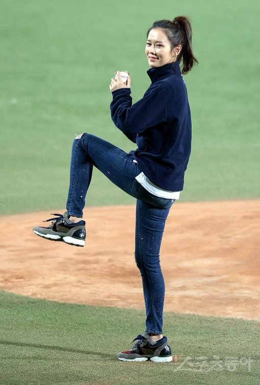 ‘2013 한국야쿠르트 세븐’ 프로야구 두산베어스 대 삼성라이온즈 한국시리즈 7차전 경기가 1일 대구시민운동장에서 열렸다. 경기 전 탤런트 손예진이 시구를 하고 있다.