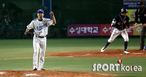 ‘2013 한국야쿠르트 세븐 프로야구’ 삼성 라이온즈와 두산 베어스의 한국시리즈 7차전이 1일 오후 대구 시민야구장에서 열렸다. 삼성 차우찬이 8회초 2사 2루에서 두산 정수빈을 삼진으로 처리한 후 환호하고 있다.