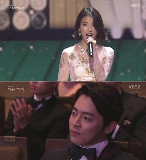 이날 아이유는 시스루 의상을 입고 무대에 올랐다. 아이유의 무대가 진행되는 동안 화면에 KBS2 ‘최고다 이순신’에서 연인으로 호흡을 맞춘 바 있는 조정석의 모습이 전파를 타 시청자들의 눈길을 끌었다.