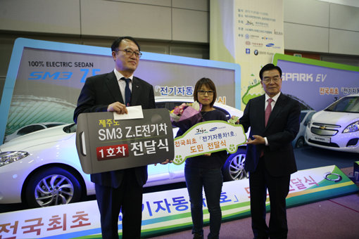 르노삼성자동차(대표이사 프랑수아 프로보)는 1일 제주 국제컨벤션센터에서 열리고 있는 제4회 스마트그리드 데이에서 우근민 제주도지사와 김상우 르노삼성자동차 영업총괄 담당 이사 및 관계자 200여명이 참석한 가운데 SM3 Z.E. 1호차의 주인공으로 선정된 김정옥(40. 제주시 이도1동) 씨에게 차량 전달 행사를 가졌다.