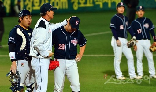 비록 준우승에 그쳤지만 유희관, 최재훈 등 두산 젊은 선수들의 선전은 돋보였다. 1일 대구구장에서 열린 한국시리즈 7차전에서 두산 정명원 투수코치(왼쪽 2번째)가 마운드에 올라 선발투수 유희관(왼쪽 3번째)을 다독이고 있다. 왼쪽 끝은 포수 양의지. 대구|박화용 기자 inphoto@donga.com 트위터 @seven7sola