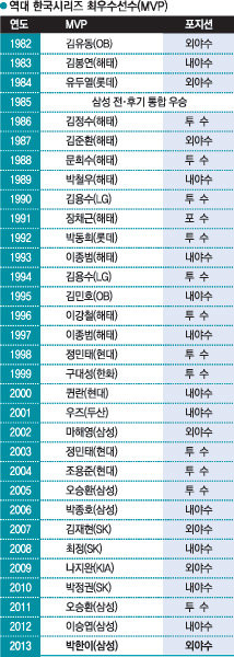 박한이는 KS 개인통산 최다안타(48개), 최다타점(25개), 최다득점(33개), 최다루타(67개), 최다볼넷(27개), 최다4사구(32개) 등 6개 부문에서 모두 1위에 올라섰다. ‘한국시리즈 인간문화재’라고 해도 지나친 말이 아니다. 그러나 그는 “나도 팀을 잘 만났고, 좋은 동료들이 있었기 때문에 이런 기록들도 쓸 수 있었다”며 겸손해했다. 이번 KS MVP에 대해서도 “투수 쪽에서 오승환, 차우찬, 안지만 등이 정말 잘 던졌다. 내가 MVP가 아니라 우리 팀 전원이 MVP다”고 말했다.