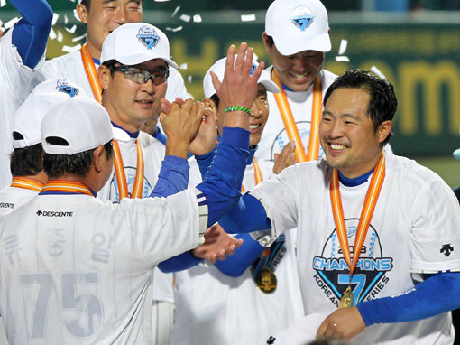 삼성 박한이(오른쪽 끝)가 1일 대구구장에서 열린 KS 7차전 승리로 우승을 확정한 뒤 기념 티셔츠를 입고 류중일 감독(왼쪽 아래)과 하이파이브를 나누고 있다. 박한이는 생애 첫 KS MVP로 선정됐다. 사진제공|스포츠코리아