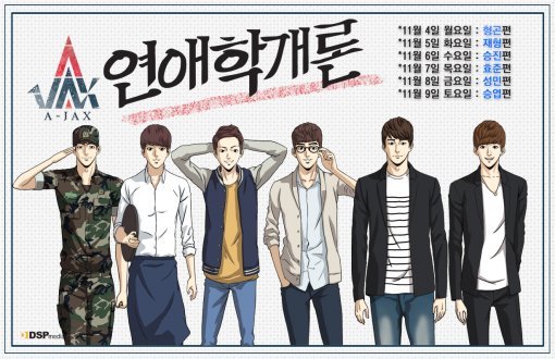 에이젝스는 지난 4일 자정, 에이젝스 공식 SNS를 통해 자신들을 주인공으로 한 온라인 ‘웹툰’ 티져 이미지를 공개했다. 이 티져 이미지에서 에이젝스는 멤버들의 특징을 그대로 살려낸 캐릭터로 변신, 4일부터 공개될 에이젝스의 ‘연애학개론’ 웹툰 공개를 예고했다.