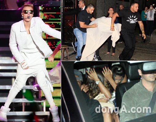 공개된 사진에는 저스틴 비버가 머리부터 발끝까지 흰색 천을 뒤집어쓴 채 경호원의 보호를 받으며 황급히 빠져나가는 모습이 담겨 있다. 저스틴 비버는 업소 앞에 준비된 SUV 차량을 통해 현장을 떠났다.