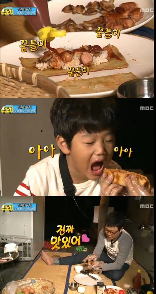 처음에는 의아해 하던 김성주는 ‘준수 어묵김밥’을 맛본 뒤 “진짜 맛있다. 이거 진짜 맛있다”며 놀라워했다. 김성주는 준수가 어묵김밥을 다 먹은 뒤에도 자신이 직접 어묵김밥을 만들어 먹으며 감탄했다.