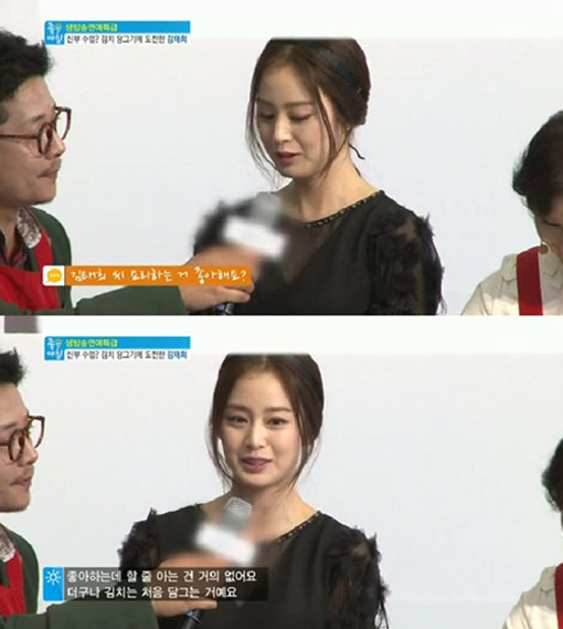 이에 요리연구가 이종임은 “김치를 담글 줄 알아야한다. 그래야 결혼해서 사랑 받는다”고 조언했고, 김태희는 수줍게 웃어보였다.