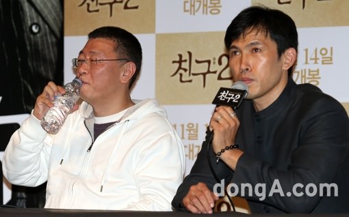 감독 곽경택(왼쪽)과 배우 유오성이 4일 오후 서울 광진구 롯데시네마 건대입구점에서 열린 영화 '친구2' 시사회에 참석해 취재진의 질문에 답변을 하고 있다.