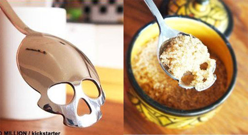 사진은 해골모양 숟가락에 설탕을 담으면 그 모양대로 해골 얼굴이 드러난다. 특히 해골 모습을 형상해 구멍이 3개가 나있어 설탕을 많이 담고 싶어도 담을 수가 없다는 특징이 있다.