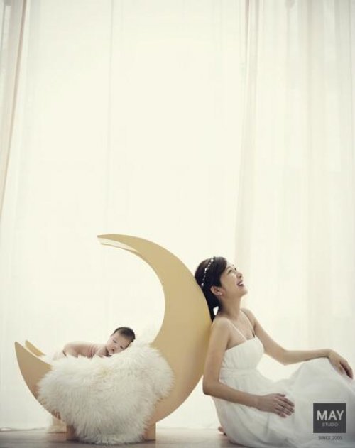 공개된 사진 속 이정민의 딸은 달 모양의 침대에 엎드려 있고, 이정민은 그 침대에 기대 앉아 행복한 미소를 짓고 있다.
