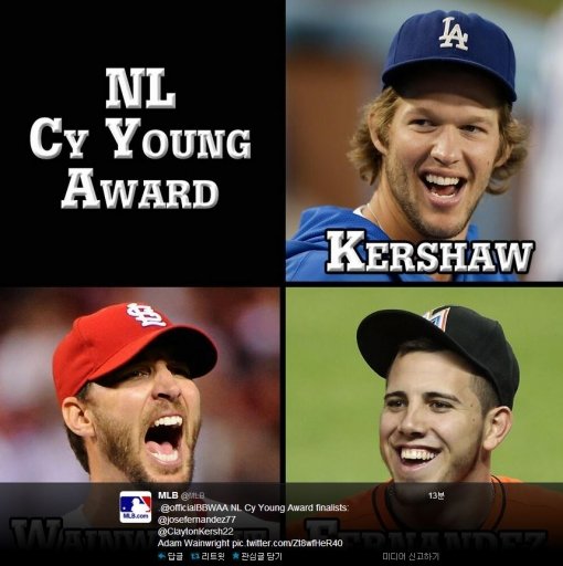 메이저리그 사무국은 6일(이하 한국시각) 이번 시즌 내셔널리그에서 가장 뛰어난 활약을 한 사이영상 후보 3인을 선정 후 발표했다.