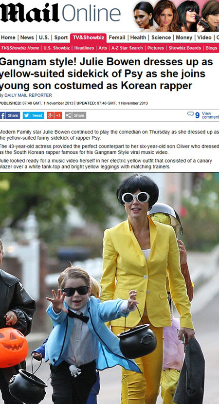 지난달 31일, 영국 일간지 데일리메일은 줄리 보웬이 할로윈데이를 맞아 그의 아들과 함께 싸이의 ‘강남스타일’을 패러디한 모습을 소개했다.