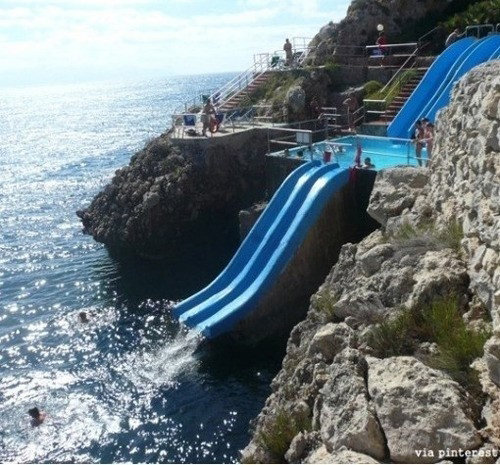 사진은 이탈리아 시칠리의 휴양지에 있는 미끄럼대를 담고 있다. 이 미끄럼대는 바닷가 절벽에서부터 바다로 떨어지는 형식으로 설치됐다.