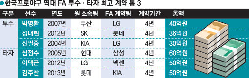 2011년 말 이대호(오릭스)는 원 소속팀 롯데가 내민 4년 총액 100억원 제안을 뿌리쳤다. 이를 제외하면 2005년 현대에서 삼성으로 이적하면서 심정수가 받은 4년간 총액 60억원이 한국프로야구 역대 최고 FA 계약이다.<표 참고> 투수 중 최고액은 2007년 박명환이 두산에서 LG로 넘어가며 받은 4년 총액 40억원이다. 2012년과 2013년, 타자 이택근과 김주찬은 각각 넥센과 KIA 유니폼을 입으며 나란히 4년 총액 50억원의 대박을 터트렸다.