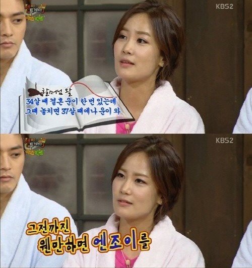 이날 방송에서 김지민은 “사주에 남자가 없다고 하더라. 34세 때 결혼운이 한번 있는데 그 때를 놓치면 37세 때 결혼운이 또 있다고 했다”며 말문을 열었다.