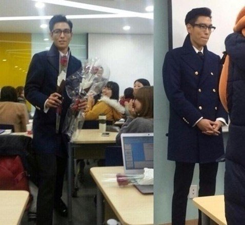 공개된 ‘탑 목격담’ 사진 속 탑은 깔끔한 코트 차림에 안경을 쓰고 서울여대 강의실을 찾아 여대생들에게 인사말을 전하고 장미꽃을 나눠주고 있다. 탑은 강단 앞에 서서 수줍은 미소를 짓고 있어 눈길을 끈다.