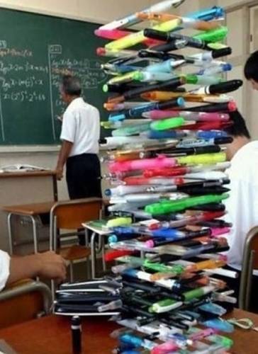 공개된 사진에는수업 중 학생들이 필기구로 탑을 쌓고 있는 장면이 담겨 있다. 한 눈에 봐도 어마어마한 높이로 쌓아 올린 필기구 탑이 놀라움을 자아내고 있는 것.