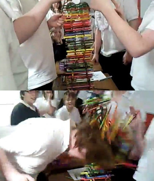 최근 온라인 게시판에 공개된 영상 속 외국 학교의 학생들은 필기구를 쌓아 꽤 높은 탑을 만들었다.