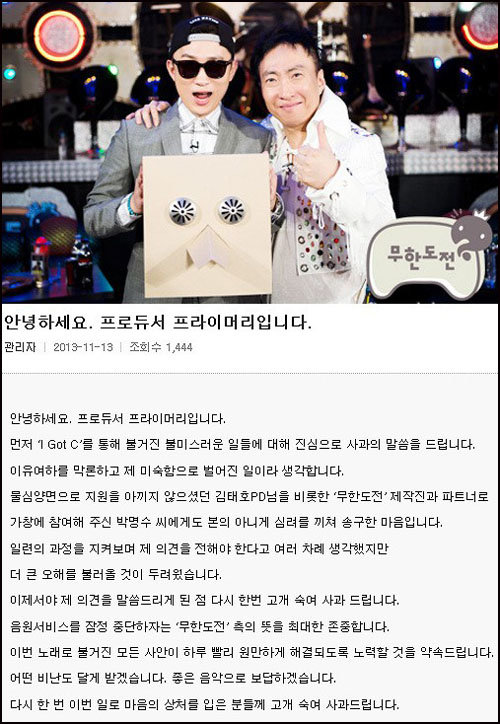 프라이머리는 사과문을 통해 “이유 여하를 막론하고 나의 미숙함으로 벌어진 일이라 생각한다”며 “‘무한도전’ 제작진과 박명수 씨에게도 송구하다”고 사과의 뜻을 전했다.