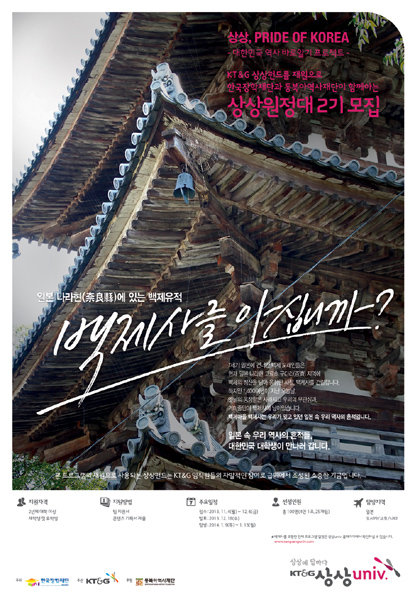 일본에 있는 우리 역사의 흔적을 찾아가는 이번 탐방은 교육부 산하 동북아역사재단의 후원으로 진행되며 소요비용은 KT&G 상상펀드에서 지원된다. ‘상상펀드’는 KT&G 임직원들의 자발적인 기부금과 회사의 지원금으로 적립한 KT&G만의 독창적 사회공헌기금으로 올해 운영 규모는 약 35억원이다. 참가 신청은 대학생이면 누구나 4명 1팀을 구성할 수 있다. 지원 신청서와 탐방 계획서를 작성하여 KT&G 상상유니브 홈페이지(www.sangsanguniv.com)에 제출하면 된다. 서류심사와 온라인 응원점수를 합산해 25개 팀 100명이 최종 선발된다. 이들은 내년 1월 중 일본 오사카, 교토, 나라 지역에서 우리 역사를 탐방하게 된다.