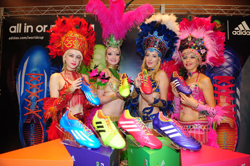 아디다스가 13일 서울 장충동 신라호텔 영빈관 2층 에메랄드 룸에서 2014 FIFA 월드컵이 열리는 브라질의 삼바 댄스에서 영감을 받은 화려하고 컬러풀한 디자인의 아디다스 ‘삼바 컬렉션’ 축구화 4종을 공개했다.