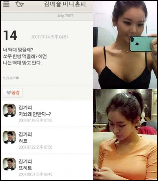 지난 2007년 맹승지가 올린 “너 백대 맞을래? 소주 한병 먹을래? 하면 나는 백대 맞고 만다”는 글에 김기리가 “전화 왜 안 받지?”, “하트”, “또 하트”라고 댓글을 단 것을 포착한 것.
