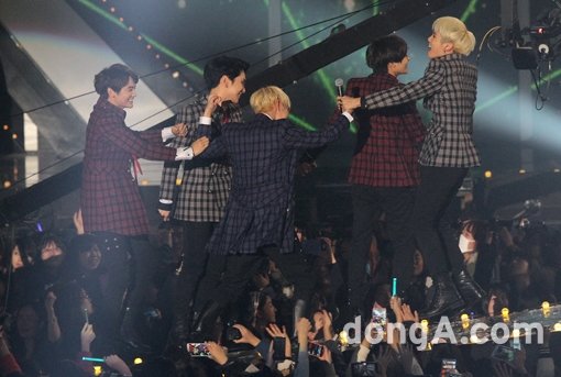 그룹 샤이니가 14일 오후 서울 송파구 올림픽공원 체조경기장에서 열린 ‘2013 멜론 뮤직 어워드’에서 대상을 수상하고 있다.