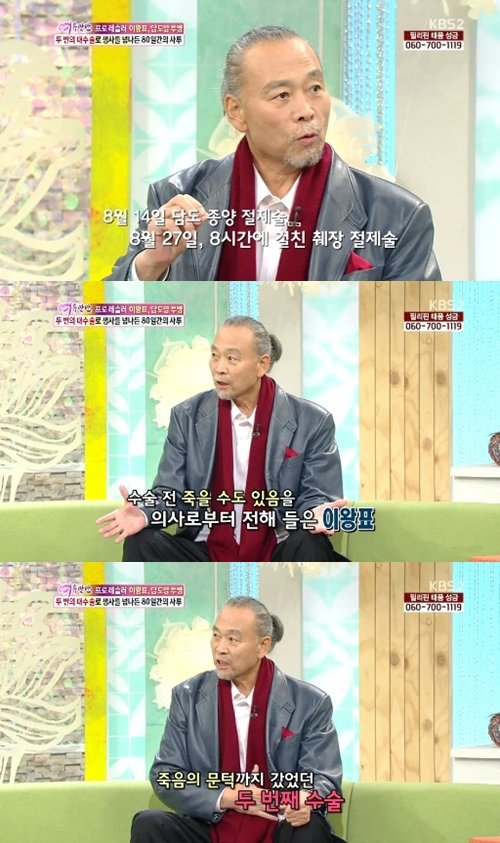 이왕표는 15일 방송된 KBS 2TV ‘여유만만’에 출연했다. 그는 이 방송에서 “담도암 판정을 받고 80일 동안 두 차례 대수술로 투병생활을 했다”고 밝혔다.
